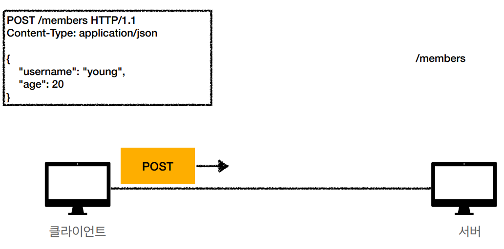 - POST, PUT, PATCH: 메시지 바디를 통해 데이터 전송