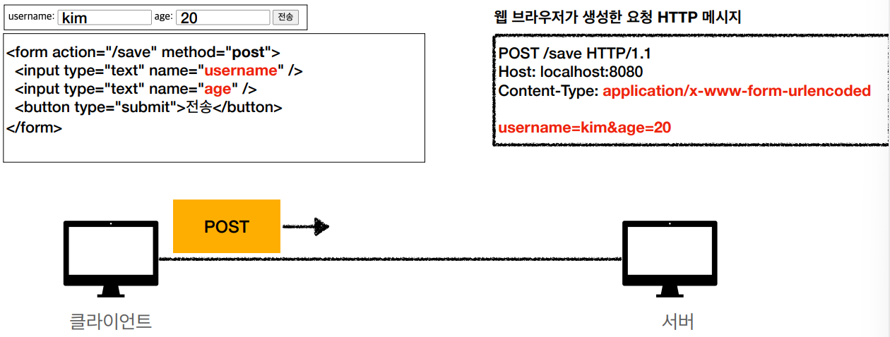 : form의 내용을 메시지 바디를 통해서 전송(key=value, 쿼리 파라미터 형식)