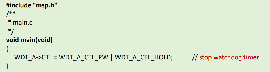 WDT_A->CTL = WDT_A_CTL_PW | WDT_A_CTL_HOLD; //stop watchdog timer