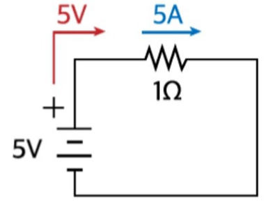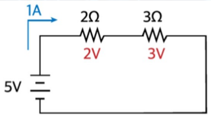 | 5V 전원과 1Ω이 연결되어 있다면, 전류는 5A | 직렬 연결: 2Ω과 3Ω → 총 저항 값 5Ω 5V 전압이 공급될 때 전류 1A 1A → 2Ω 저항에 공급되는 전압 2V 1A → 3Ω 저항에 공급되는 전압 3V |