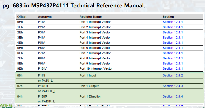 - 예) P1.0: GPIO port 1 (00000001) / pin 0
